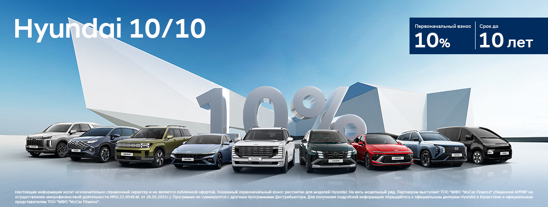 Оцените новый уровень доступности: всего 10% первоначального взноса — и вы уже за рулём нового Hyundai. Это идеальное сочетание выгодных условий, простоты оформления и легендарного качества, которое мы называем 10 из 10. Hyundai 10/10 — когда всё действительно на высшем уровне.
